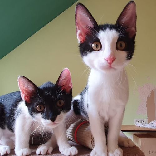 Sie sind zwei liebe, lebhafte und neugierige Katzenkinder mit einer ganz besonderen Eigenschaft. Will man durchlüften, packt man die beiden einfach in eine große Box. Sie legen sich sofort schlafen und man kann in Ruhe alle Fenster aufreißen. Auch Kuchenbacken und andere Tätigkeiten, bei denen sie nicht mittendurch stiefeln sollen, haben sie schon von der Box aus eifrig und ohne zu meckern überwacht.