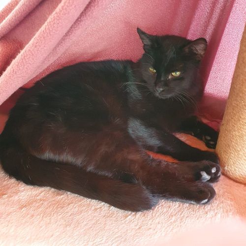 Tick ist ein Fundtier und zeigt sich im Katzenhaus schüchtern, aber sehr nett. Für einen schwarzen Kater hat er ein sehr zartes, quietschiges Stimmchen. Aber er ist auch kein Riese, von daher passt das schon.