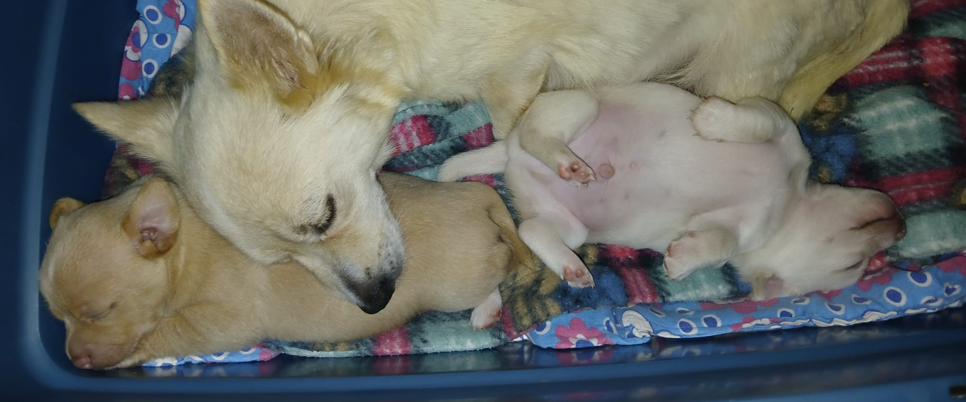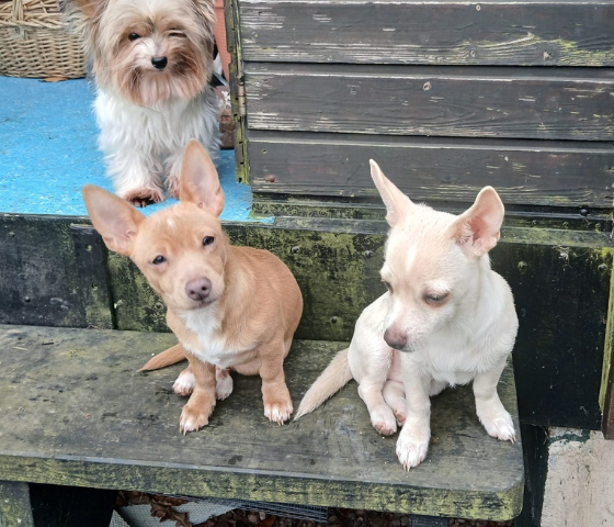 Wir wissen schon, dass man nicht in die Wohnung macht, aber so ganz klappt das noch nicht. Wir benehmen uns auch mittlerweile beim Autofahren und bleiben auch ein bißchen alleine zuhause. Als Chihuahuamixe sind wir natürlich auch sehr lebhaft und wachsam und schlagen an, wenn uns was komisch vorkommt! Deshalb üben wir auch gerade Hundebegegnungen, weil wir da erstmal immer ziemlich laut sind. Wenn wir ausgepowert sind, lieben wir es zu schmusen, auf dem Schoß von Mama zu schlafen oder im Bett.