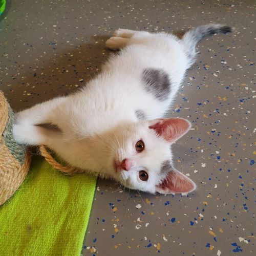 Naja, zugegeben, den älteren Katzen im Katzenhaus geht er ein wenig auf den Geist. Aber er ist einfach herzallerliebst. Er bringt wirklich jeden zum Lachen.